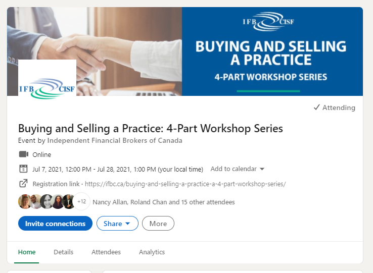 | 4 hours for Life License AAC: 4 hours Life, 4 hours General RIBO: 2 hours Personal Skills, 2 hours Management FP Canada: 4 hours Practice Management | Workshop #1:The Seller's Perspective Wednesday July 7, 2021 – 12 p.m. – 1 p.m. Eastern time Workshop #2: The Buyer's Perspective Wednesday July 14, 2021 – 12 p.m. – 1 p.m. Eastern time Workshop #3: The Current Market Wednesday July 21, 2021 – 12 p.m. – 1 p.m. Eastern time Workshop #4: The Business Broker's Perspective Wednesday July 28, 2021 – 12 p.m. – 1 p.m. Eastern time | Early Bird: $49 IFB members | $99 all others (Ends Monday, June 28th) Regular: $69 IFB members | $119 all others Prices include all four workshops | |