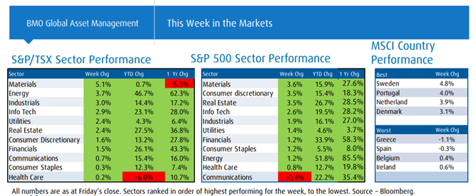 • The S&P/TSX Index surged 2.5%. Resource prices helped lift the broad index as oil prices (WTI Crude) reached its highest level since 2014, crossing $80/barrel. Every sector was positive, while bank stocks tracked their U.S. counterparts higher despite a retreat in longer-term rates.