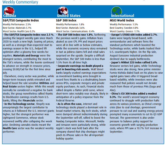 • The S&P 500 Index rose 1.8%. Inflation fears abated while corporate earnings got off to a strong start, boosting risk assets. Technology stocks saw its strongest rally after a difficult September and contributed the most to gains, while Financials also had a strong week as banks posted record investment banking profits.