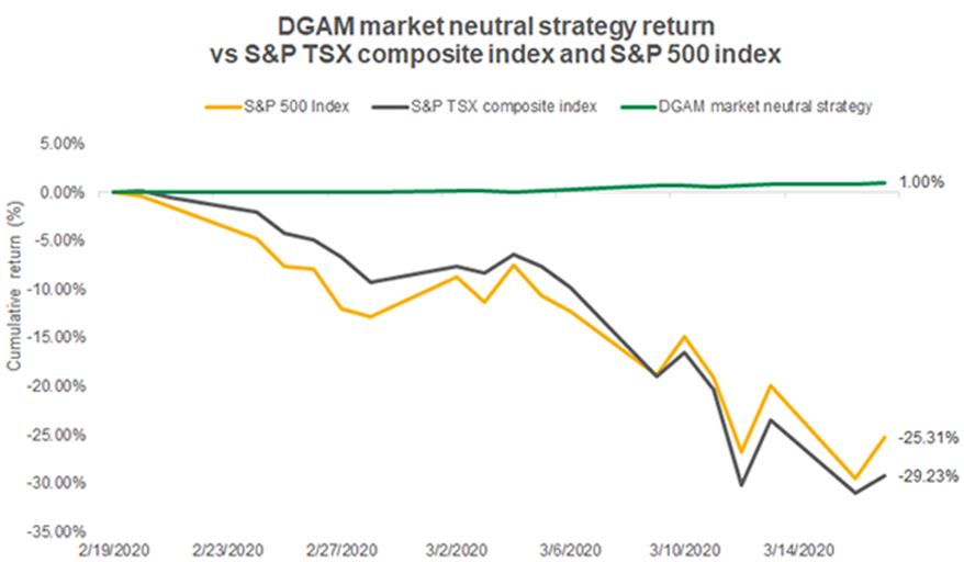 These returns are presented for information purposes and reflect the returns of the DGAM Canadian equities market neutral strategy from February 19th 2020 to March 17th 2020, net of commissions, transaction and borrowing fees, and excluding fixed income returns and management fees. The sources of information include Bloomberg and DGAM's internal database.