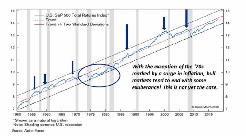 We also know from history that a bear market, which is defined by a 20%+ fall from the recent peak, coincides with recessions, and our economic dashboards are still flashing green. In fact, historically, we have rarely seen a bear market starting when the S&P 500 is at or below its long-term trend, as it remains currently despite the recent hefty valuations (see chart below).