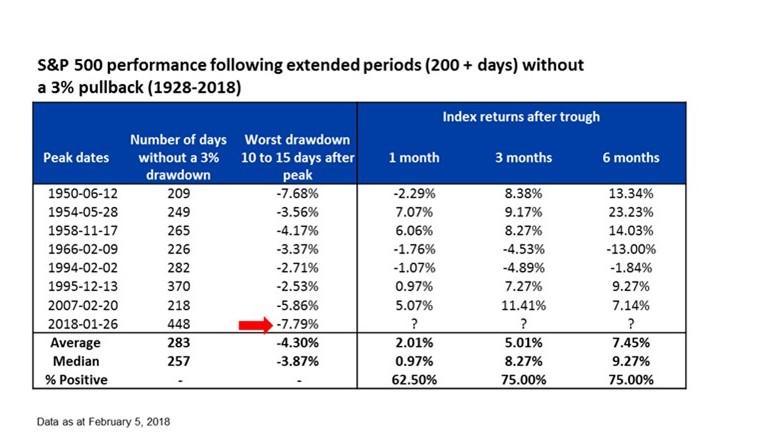 Many signs were pointing towards some short-term vulnerability in the markets: the 14% gap between the level of the S&P 500 and its 200-days moving average, or the fact that we had just recorded the longest stretch without a 3% drawdown since 1950, at 448 days (see table below), to name a few. As is common during corrections, we quickly shifted to a “stock market” instead of a “market of stocks”, leaving few places to hide.