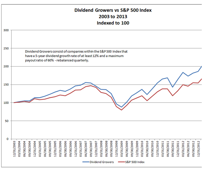 Using Bloomberg we screened the S&P 500 Index for companies with a 5-year dividend growth rate of at least 12% and a payout ratio of no more than 60%. This screen was back tested and rebalanced on a quarterly basis going back ten years to 12/31/2003. What we found was a portfolio of approximately 100 companies, an average quarterly turnover rate of 18.6% and a 10-year annualized performance of 9.93%. The S&P 500 Index returned 7.41% over the same period. These results assume all dividends are paid out an not reinvested.